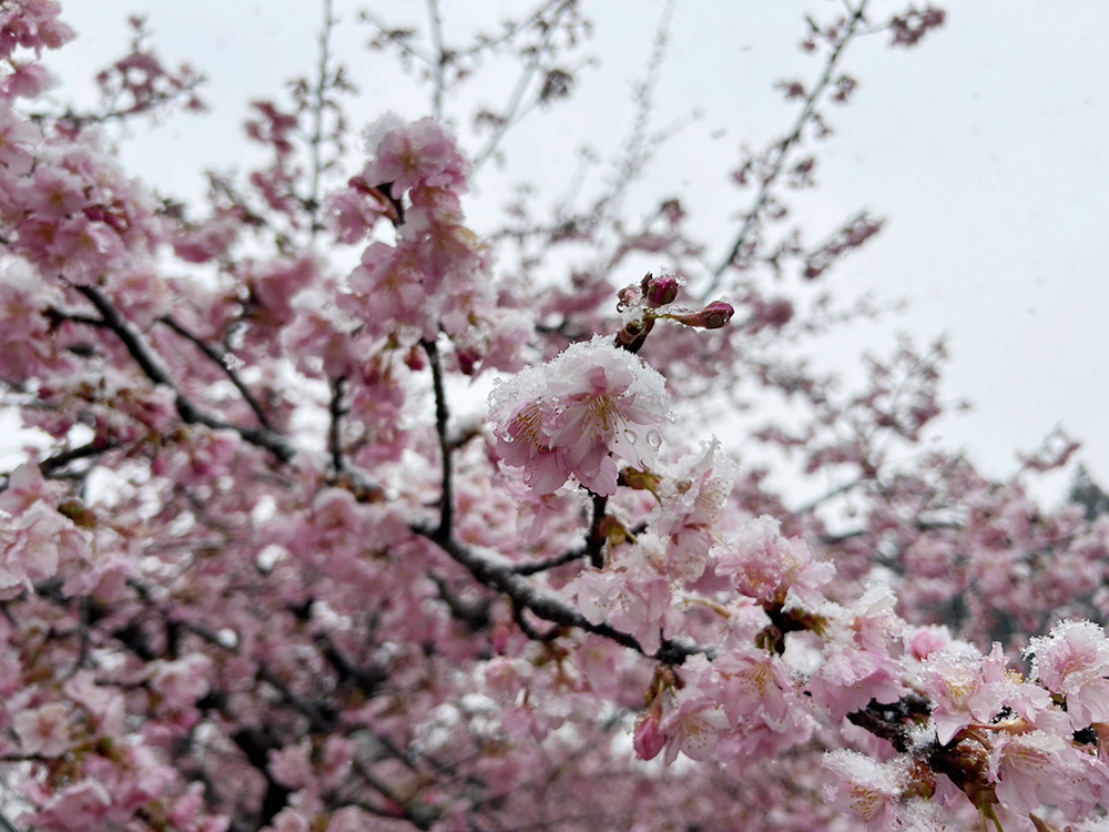 今年は河津桜の開花が例年になく早く、すでに見頃を迎えていたこともあり、河津桜と菜の花、そして雪が重なる、なかなか見ることのできない風景となりました。
