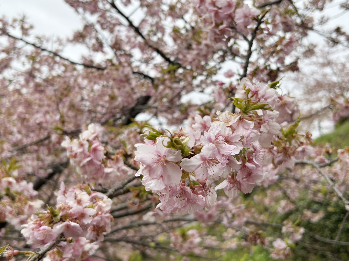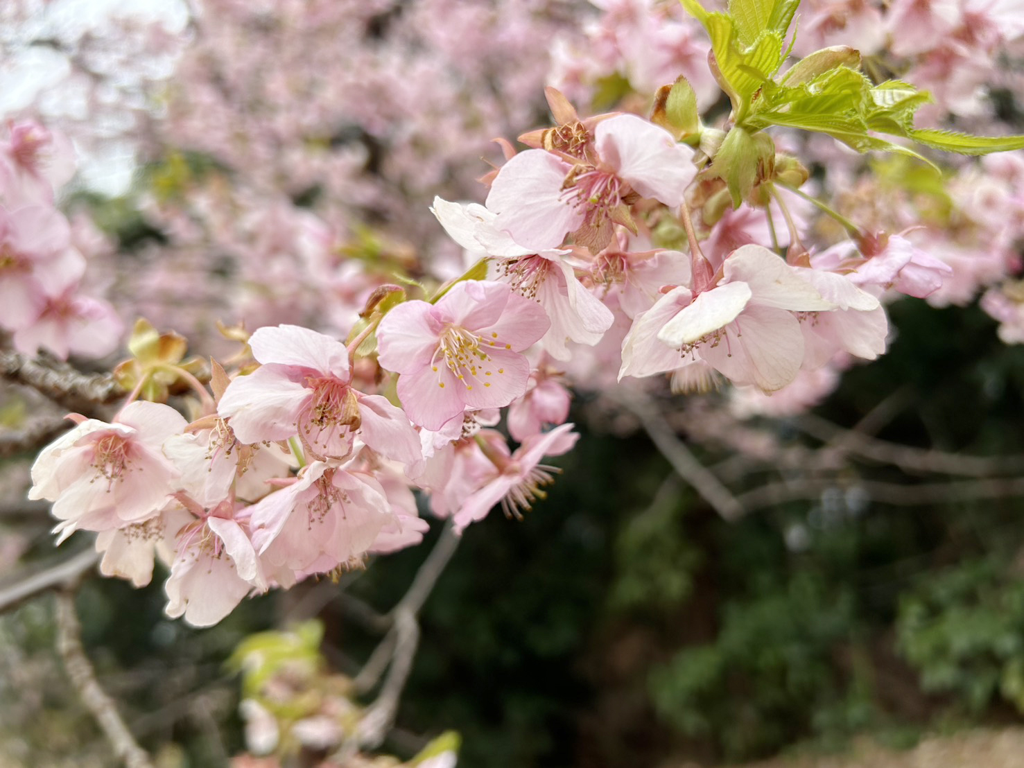 現在、河津桜は少しずつ葉が出始めて、葉桜になっている木もありますが、個体差がありますので、まだ華やかな木もあります。