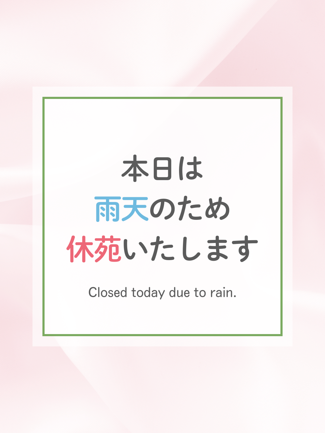 2026年2月25日 / 最終更新日 : 2026年2月25日 webmaster あぐりパーク 2/25(水)は雨天のため閉苑いたします 2月25日(水)は雨天のため、あぐりパーク嵯峨山苑は閉苑となります。